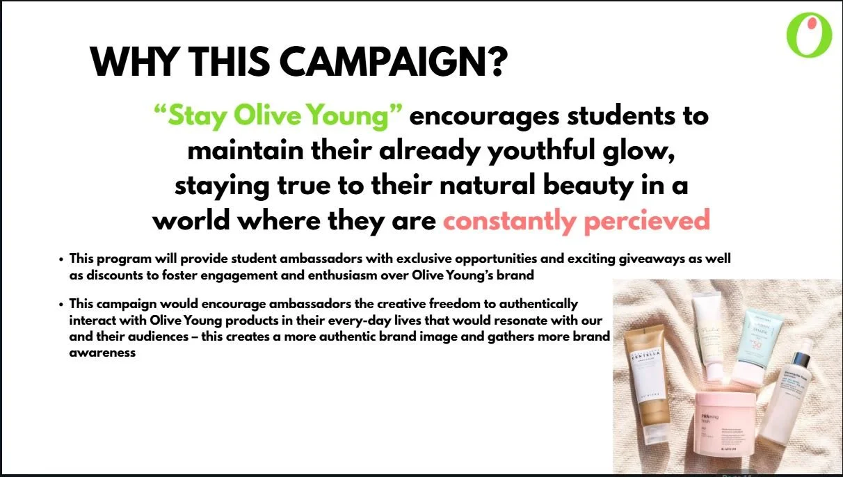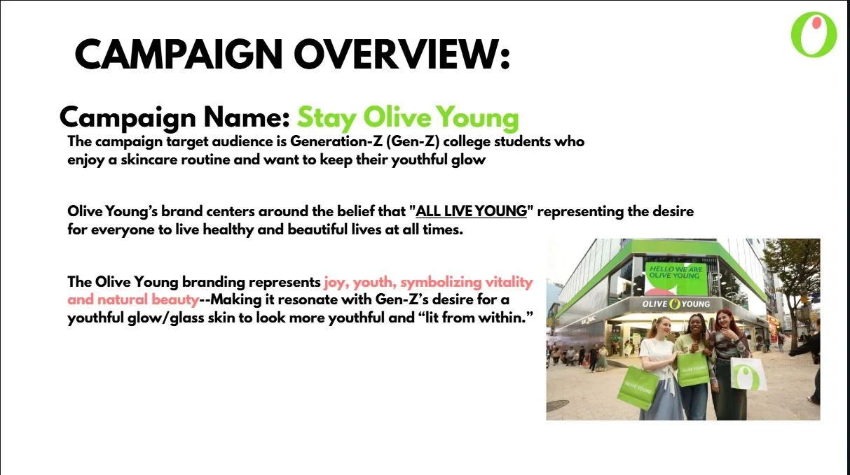 Korean beauty has taken the world by storm. Its reach and influence have captured the hearts of many—especially college-aged students. Gen Z students in college struggle to prioritize self-care, but Olive Young has them covered—enter “Stay Olive Young.” A campaign that keeps Gen Z youthful with their natural beauty, encouraging them in a world where they are constantly perceived, and reminds them that self-care can be soothing!